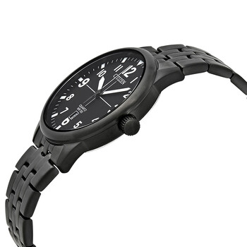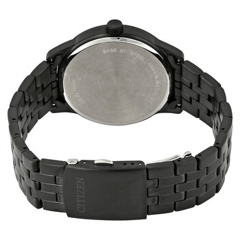 Black-plated stainless steel case and bracelet. Fixed black-plated bezel. Black dial with luminous hands and Arabic numeral hour markers. Minute markers around the outer rim. Dial Type: Analog. Luminescent hands and markers. Date display at the 6 o'clock position. Quartz movement. Scratch resistant mineral crystal. Pull / push crown. Solid case back. Round case shape. Case size: 40 mm. Case thickness: 9 mm. Band width: 18 mm. Fold over clasp with a push button release. Water resistant at 50 meters / 165 feet. Functions: date, hour, minute, second. Casual watch style. Watch label: Japan Movt. Citizen Quartz Black Dial Men's Watch BI1055-52E.