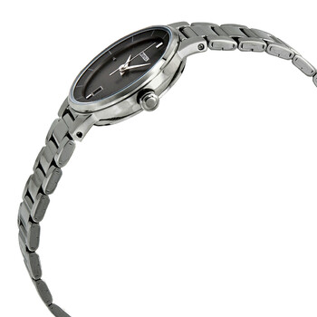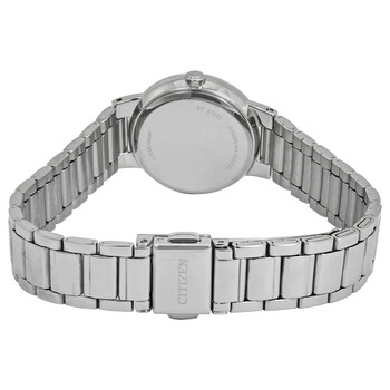 Stainless steel case with a stainless steel bracelet. Fixed stainless steel bezel. Black dial with silver-tone hands and index hour markers. Dial Type: Analog. Date display above the 6 o'clock position. Citizen caliber G011 quartz movement. Scratch resistant mineral crystal. Pull / push crown. Solid case back. Round case shape. Case size: 27 mm. Case thickness: 7 mm. Band width: 14 mm. Band length: 8.5 inches. Fold over clasp with a safety release. Water resistant at 50 meters / 165 feet. Functions: date, hour, minute, second. Casual watch style. Watch label: Japan Movt. Citizen Quartz Black Dial Stainless Steel Ladies Watch EU6010-53E.