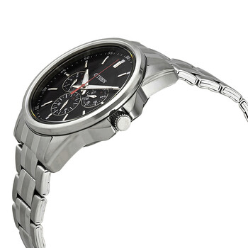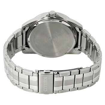 Stainless steel case with a stainless steel bracelet. Fixed stainless steel bezel. Black dial with luminous silver-tone hands and index hour markers. Arabic numeral minute markers (at 5 minute intervals). Minute markers around the outer rim. Dial Type: Analog. Luminescent hands and markers. Three multi-function sub-dials displaying: date, day of the week and 24 hour. Quartz movement. Scratch resistant mineral crystal. Pull / push crown. Solid case back. Round case shape. Case size: 42 mm. Case thickness: 11 mm. Band width: 22 mm. Fold over clasp with a push button release. Water resistant at 100 meters / 330 feet. Functions: date, day, hour, minute, second, 24 hour. Casual watch style. Watch label: Japan Movt. Citizen Quartz Black Dial Stainless Steel Men's Watch AG8340-58E.
