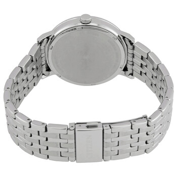 Stainless steel case with a stainless steel bracelet. Fixed stainless steel bezel. Black dial with silver-tone hands and index hour markers. Dial Type: Analog. Small seconds sub-dial. Quartz movement. Scratch resistant mineral crystal. Pull / push crown. Solid case back. Round case shape. Case size: 39 mm. Case thickness: 10 mm. Band width: 20 mm. Fold over clasp with a push button release. Water resistant at 50 meters / 165 feet. Functions: hour, minute. Casual watch style. Citizen Quartz Black Dial Stainless Steel Men's Watch BE9170-56E.