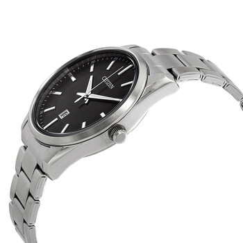 Stainless steel case with a stainless steel bracelet. Fixed stainless steel bezel. Black dial with luminous silver-tone hands and index hour markers. Arabic numeral minute markers (at 5 minute intervals). Minute markers around the outer rim. Dial Type: Analog. Luminescent hands and markers. Date display above the 6 o'clock position. Quartz movement. Scratch resistant mineral crystal. Pull / push crown. Solid case back. Round case shape. Case size: 42 mm. Case thickness: 9.5 mm. Band width: 20 mm. Fold over clasp with a safety release. Water resistant at 30 meters / 100 feet. Functions: date, hour, minute, second. Casual watch style. Watch label: Japan Movt. Citizen Quartz Black Dial Stainless Steel Men's Watch BI1030-53E.