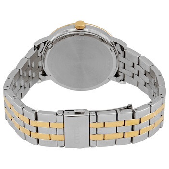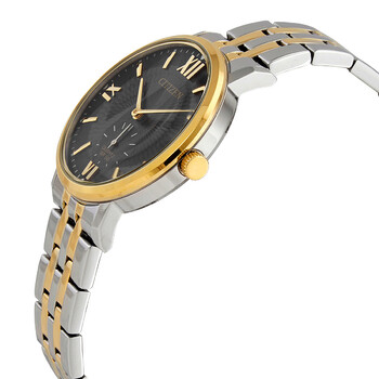 Stainless steel case with a two-tone (silver-tone and gold-tone) stainless steel bracelet. Fixed gold-tone bezel. Black dial with gold-tone hands and index hour markers. Roman numerals appear at the 3, 6, 9 and 12 o'clock positions. Minute markers around the outer rim. Dial Type: Analog. Small seconds sub-dial. Citizen caliber 1045 quartz movement. Scratch resistant mineral crystal. Pull / push crown. Solid case back. Round case shape. Case size: 39 mm. Case thickness: 9.8 mm. Band width: 20 mm. Fold over clasp with a push button release. Water resistant at 50 meters / 165 feet. Functions: hour, minute. Casual watch style. Citizen Quartz Black Dial Two-tone Men's Watch BE9176-76E.