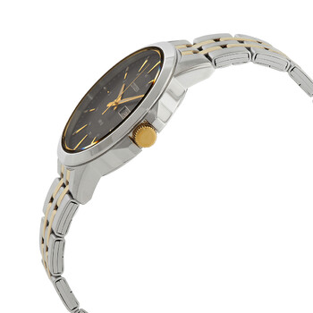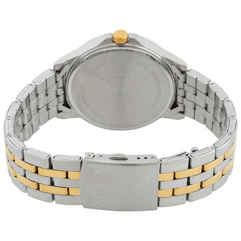 Stainless steel case with a two-tone (silver-tone and gold-tone) stainless steel bracelet. Fixed stainless steel bezel. Black dial with luminous gold-tone hands and index hour markers. Arabic numeral minute markers (at 5 minute intervals). Minute markers around the outer rim. Dial Type: Analog. Luminescent hands and markers. Day of the week and date display at the 3 o'clock position. Citizen caliber 1502 quartz movement. Scratch resistant mineral crystal. Pull / push crown. Solid case back. Round case shape. Case size: 41 mm. Case thickness: 9 mm. Band width: 20 mm. Fold over clasp with a push button release. Water resistant at 50 meters / 165 feet. Functions: date, day, hour, minute, second. Casual watch style. Watch label: Japan Movt. Citizen Quartz Black Dial Two-tone Men's Watch BF2018-52H.