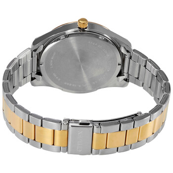Stainless steel case with a two-tone (silver-tone and gold-tone) stainless steel bracelet. Fixed gold-tone bezel. Black dial with luminous gold-tone hands and index hour markers. Arabic numeral minute markers (at 5 minute intervals). Minute markers around the outer rim. Dial Type: Analog. Luminescent hands. Date display above the 6 o'clock position. Citizen caliber 1112 quartz movement. Scratch resistant mineral crystal. Pull / push crown. Solid case back. Round case shape. Case size: 42 mm. Case thickness: 10 mm. Band width: 20 mm. Fold over clasp with a push button release. Water resistant at 100 meters / 330 feet. Functions: date, hour, minute, second. Casual watch style. Watch label: Japan Movt. Citizen Quartz Black Dial Two-tone Men's Watch BI1034-52E.