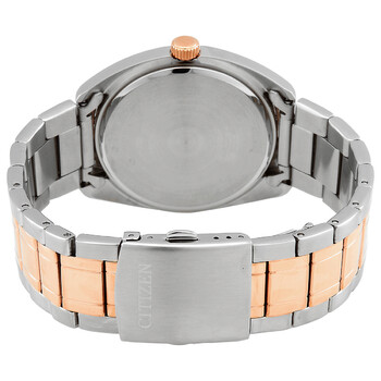 Silver-tone stainless steel case with a two-tone (silver-tone and rose gold-tone) stainless steel bracelet. Fixed rose gold-tone stainless steel bezel. Black dial with rose gold-tone hands and index hour markers. Minute markers around the outer rim. Dial Type: Analog. Luminescent hands. Date display at the 3 o'clock position. Citizen Caliber G112 quartz movement. Scratch resistant mineral crystal. Pull / push crown. Solid case back. Round case shape, case size: 41 mm, case thickness: 9 mm. Band width: 22 mm. Fold over clasp with a safety release. Water resistant at 50 meters / 165 feet. Functions: date, hour, minute, second. Casual watch style. Watch label: Japan Movt. Citizen Quartz Black Dial Two-Tone Men's Watch BI5104-57E.