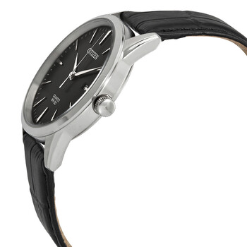Stainless steel case with a black leather strap. Fixed stainless steel bezel. Black dial with silver-tone hands and index hour markers. Minute markers around the outer rim. Dial Type: Analog. Date display at the 3 o'clock position. Citizen caliber G111 quartz movement. Scratch resistant mineral crystal. Pull / push crown. Solid case back. Round case shape. Case size: 39 mm. Case thickness: 9 mm. Band width: 22 mm. Tang clasp. Water resistant at 50 meters / 165 feet. Functions: date, hour, minute, second. Casual watch style. Watch label: Japan Movt. Citizen Quartz Black Dial Unisex Watch BI5000-10E.