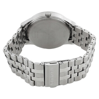 Silver-tone stainless steel case and bracelet. Fixed silver-tone stainless steel bezel. Black dial with silver-tone hands and index hour markers. Minute markers around the outer rim. Dial Type: Analog. Luminescent hands and markers. Date display at the 3 o'clock position. Citizen Caliber B690 quartz movement. Scratch resistant mineral crystal. Solid case back. Round case shape, case size: 40 mm, case thickness: 11.1 mm. Fold over clasp with a safety release. Water resistant at 50 meters / 165 feet. Functions: date, hour, minute, small second. Dress watch style. Watch label: Japan Movt. Citizen Quartz Black Dial Watch BV1119-81E.
