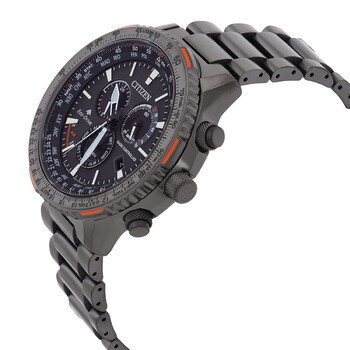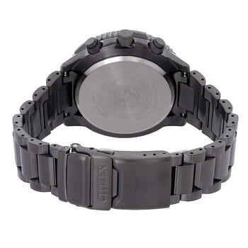 Grey stainless steel case and bracelet. Grey stainless steel bezel. Black dial with index hour markers. Dial Type: Analog. Luminescent hands and markers. Date display at the 4 o'clock position. Chronograph - three sub-dials displaying: 60 second, 60 minute and 1/10th of a second. Quartz movement. Scratch resistant sapphire crystal. Screw down crown. Solid case back. Round case shape, case size: 45.9mm, case thickness: 13.7. Water resistant at 200 meters / 660 feet. Watch label: Japan Movt.