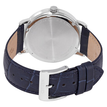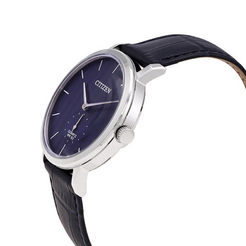 Stainless steel case with a blue leather strap. Fixed stainless steel bezel. Blue dial with silver-tone hands and index hour markers. Dial Type: Analog. Small seconds sub-dial. Citizen caliber 1045 quartz movement. Scratch resistant mineral crystal. Pull / push crown. Solid case back. Round case shape. Case size: 39 mm. Case thickness: 10 mm. Band width: 20 mm. Tang clasp. Water resistant at 50 meters / 165 feet. Functions: hour, minute. Casual watch style. Citizen Quartz Blue Dial Blue Leather Men's Watch BE9170-05L.