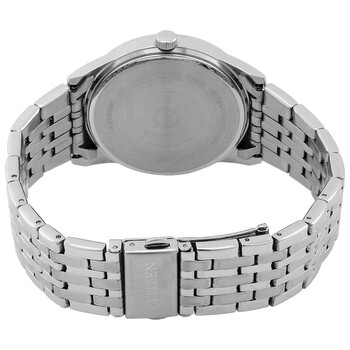 Silver-tone stainless steel case and bracelet. Fixed silver-tone stainless steel bezel. Blue dial with luminous silver-tone hands and index hour markers. Minute markers around the outer rim. Dial Type: Analog. Luminescent hands. Date display at the 3 o'clock position. Citizen Caliber G111 quartz movement. Scratch resistant mineral crystal. Pull / push crown. Solid case back. Round case shape, case size: 39 mm. Deployment with push button release clasp. Water resistant at 50 meters / 165 feet. Functions: date, hour, minute, second. Casual watch style. Watch label: Japan Movt. Citizen Quartz Blue Dial Men's Watch BI5000-87L.