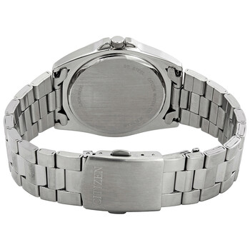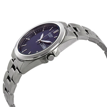 Stainless steel case with a stainless steel bracelet. Fixed stainless steel bezel. Blue dial with luminous silver-tone hands and index hour markers. Minute markers around the outer rim. Dial Type: Analog. Luminescent hands and markers. Day of the week and date display at the 3 o'clock position. Quartz movement. Scratch resistant mineral crystal. Pull / push crown. Solid case back. Round case shape. Case size: 40 mm. Case thickness: 9 mm. Band width: 22 mm. Fold over clasp with a push button release. Water resistant at 30 meters / 100 feet. Functions: date, day, hour, minute, second. Casual watch style. Watch label: Japan Movt. Citizen Quartz Blue Dial Stainless Steel Men's Watch BF0580-57L.