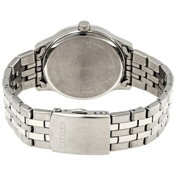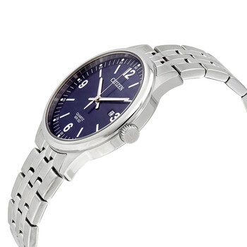 Silver-tone stainless steel case with a silver-tone stainless steel bracelet. Fixed silver-tone stainless steel bezel. Blue dial with luminous silver-tone hands and index hour markers. Arabic numerals mark the 3, 6, 9 and 12 o'clock positions. minute markers around the outer rim. Dial Type: Analog. Luminescent hands and markers. Date display at the 3 o'clock position. Quartz movement. Scratch resistant mineral crystal. Pull / push crown. Solid case back. Round case shape, case size: 40 mm. Band width: 22 mm. Fold over with push button release clasp. Water resistant at 50 meters / 165 feet. Functions: date, hour, minute, second. Casual watch style. Citizen Quartz Blue Dial Stainless Steel Men's Watch BI1050-81L.