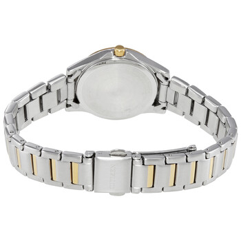 Stainless steel case with a two-tone (silver-tone and gold-tone) stainless steel bracelet. Fixed gold-tone bezel. Blue dial with gold-tone hands and alternating Arabic numeral and index hour markers. Minute markers around the outer rim. Dial Type: Analog. Luminescent hands. Day of the week and date display at the 3 o'clock position. Citizen caliber 1002 quartz movement. Scratch resistant mineral crystal. Pull / push crown. Solid case back. Round case shape. Case size: 27.5 mm. Case thickness: 7.7 mm. Band width: 14 mm. Fold over clasp. Water resistant at 50 meters / 165 feet. Functions: date, day, hour, minute, second. Casual watch style. Citizen Quartz Blue Dial Two-tone Ladies Watch EQ0595-55L.