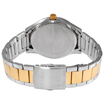 Stainless steel case with a two tone (gold-tone and silver-tone) stainless steel bracelet. Fixed stainless steel bezel. Blue dial with luminous gold-tone hands and index hour markers. Roman numerals appear at the 6, 9 and 12 o'clock positions. Minute markers around the outer rim. Dial Type: Analog. Luminescent hands and markers. Day of the week and date display at the 3 o'clock position. Quartz movement. Scratch resistant mineral crystal. Pull / push crown. Solid case back. Round case shape. Case size: 41 mm. Band width: 20 mm. Fold over clasp with a push button release. Water resistant at 50 meters / 165 feet. Functions: date, day, hour, minute, second. Casual watch style. Watch label: Japan Movt. Citizen Quartz Blue Dial Two-tone Men's Watch BF2004-57L.