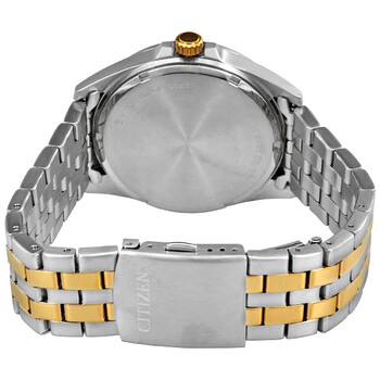 Stainless steel case with a two-tone (silver-tone and gold-tone) stainless steel bracelet. Fixed stainless steel bezel with an inlaid blue ring. Blue dial with luminous gold-tone hands and index hour markers. Minute markers around the outer rim. Dial Type: Analog. Luminescent hands and markers. Date display at the 3 o'clock position. Citizen caliber G111 quartz movement. Scratch resistant mineral crystal. Pull / push crown. Solid case back. Round case shape. Case size: 42 mm. Case thickness: 10 mm. Band width: 22 mm. Fold over clasp with a push button release. Water resistant at 100 meters / 330 feet. Functions: date, hour, minute, second. Casual watch style. Citizen Quartz Blue Dial Two-tone Men's Watch BI5054-53L.