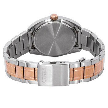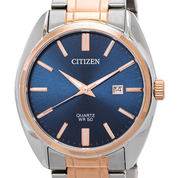 Silver-tone stainless steel case with a two-tone (silver-tone and rose gold-tone) stainless steel bracelet. Fixed rose gold-tone stainless steel bezel. Blue dial with rose gold-tone hands and index hour markers. Minute markers around the outer rim. Dial Type: Analog. Luminescent hands. Date display at the 3 o'clock position. Citizen Caliber G112 quartz movement. Scratch resistant mineral crystal. Pull / push crown. Solid case back. Round case shape, case size: 41 mm, case thickness: 9 mm. Band width: 22 mm. Fold over clasp with a safety release. Water resistant at 50 meters / 165 feet. Functions: date, hour, minute, second. Casual watch style. Watch label: Japan Movt. Citizen Quartz Blue Dial Two-tone Men's Watch BI5104-57L.