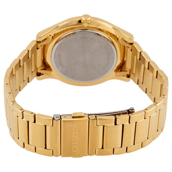 Gold-tone stainless steel case and bracelet. Fixed gold-tone bezel. Champagne dial with gold-tone hands and index hour markers. Arabic numerals appear at the 6 and 12 o'clock positions. Minute markers around an inner ring. Dial Type: Analog. Date display at the 3 o'clock position. Citizen caliber 9713 quartz movement. Scratch resistant mineral crystal. Pull / push crown. Solid case back. Round case shape. Case size: 39 mm. Case thickness: 7 mm. Band width: 20 mm. Fold over clasp with a push button release. Water resistant at 50 meters / 165 feet. Functions: date, hour, minute, second. Dress watch style. Watch label: Japan Movt. Citizen Quartz Champagne Dial Gold-tone Men's Watch BD0043-83P.