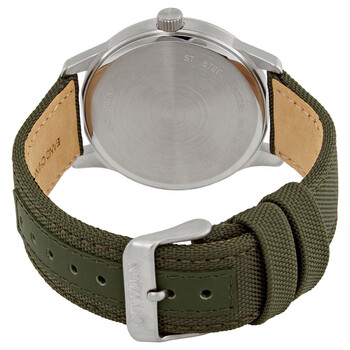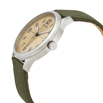 Stainless steel case with a green nylon strap. Fixed stainless steel bezel. Champagne dial with luminous black hands and Arabic numeral hour markers. Minute markers around the outer rim. Dial Type: Analog. Luminescent hands. Date display at the 6 o'clock position. Citizen Caliber 1112 quartz movement. Scratch resistant mineral crystal. Pull / push crown. Solid case back. Round case shape. Case size: 40 mm. Case thickness: 9 mm. Band width: 20 mm. Tang clasp. Water resistant at 50 meters / 165 feet. Functions: date, hour, minute, second. Casual watch style. Citizen Quartz Champagne Dial Green Nylon Men's Watch BI1050-05X.