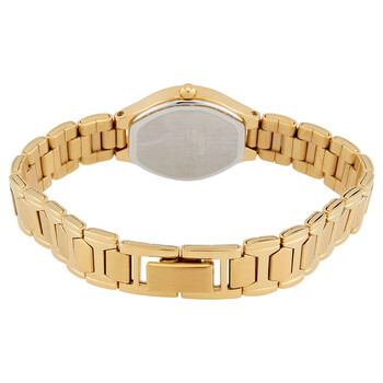 Yellow gold-tone stainless steel case and bracelet. Fixed yellow gold-tone stainless steel bezel. Champagne dial with yellow gold-tone hands and Arabic numeral hour markers. Minute markers around the outer rim. Dial Type: Analog. Date display at the 3 o'clock position. Quartz movement. Scratch resistant mineral crystal. Pull / push crown. Solid case back. Round case shape, case size: 23 mm, case thickness: 7 mm. Band width: 11 mm. Fold over clasp with a push button release. Water resistant at 30 meters / 100 feet. Functions: date, hour, minute, second. Eco Series. Casual watch style. Citizen Quartz Champagne Dial Ladies Watch EU2252-56P.