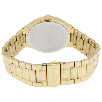Yellow gold-tone stainless steel case and bracelet. Fixed yellow gold-tone bezel. Champagne dial with yellow gold-tone hands and index hour markers. Roman numerals mark the 3, 6, 9 and 12 o'clock positions. Minute markers around the outer rim. Dial Type: Analog. Date display at the 3 o'clock position. Citizen caliber G111 quartz movement. Scratch resistant mineral crystal. Pull / push crown. Solid case back. Round case shape. Case size: 38 mm. Case thickness: 8.5 mm. Band width: 18 mm. Fold over clasp with a push button release. Water resistant at 50 meters / 165 feet. Functions: date, hour, minute, second. Casual watch style. Watch label: Japan Movt. Citizen Quartz Champagne Dial Yellow Gold-tone Men's Watch BI5022-50P.