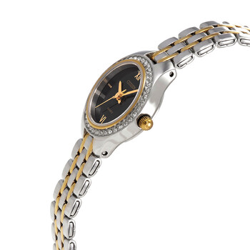 Stainless steel case with a two-tone (silver-tone and gold-tone) stainless steel bracelet. Fixed stainless steel bezel set with crystals. Black dial with gold-tone hands. Roman numerals appear at the 6 and 12 o'clock positions. Index markers at the 3 and 9 o'clock positions. Dial Type: Analog. Quartz movement. Scratch resistant mineral crystal. Pull / push crown. Solid case back. Round case shape. Case size: 21.4 mm. Case thickness: 11 mm. Band width: 11 mm. Fold over clasp with a push button release. Water resistant at 30 meters / 100 feet. Functions: hour, minute, second. Dress watch style. Citizen Quartz Crystal Black Dial Ladies Watch EJ6144-56E.