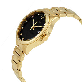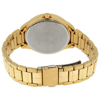 Yellow gold-tone stainless steel case and bracelet. Fixed yellow gold-tone bezel. Black dial with luminous yellow gold-tone hands and crystal hour markers. An Arabic numeral appears at the 12 o'clock position. Minute markers around the outer rim. Dial Type: Analog. Luminescent hands. Date display at the 3 o'clock position. Quartz movement. Scratch resistant mineral crystal. Pull / push crown. Solid case back. Round case shape. Case size: 36 mm. Case thickness: 9 mm. Band width: 14 mm. Fold over clasp. Water resistant at 30 meters / 100 feet. Functions: date, hour, minute, second. Dress watch style. Watch label: Japan Movt. Citizen Quartz Crystal Black Dial Yellow Gold-tone Ladies Watch EV0052-50E.
