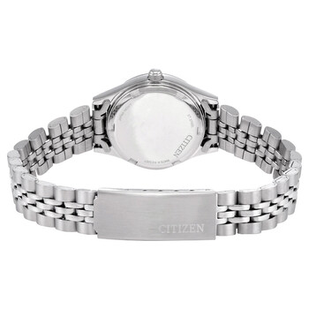 Stainless steel case with a stainless steel bracelet. Fixed stainless steel bezel set with crystals. Blue dial with luminous silver-tone hands and index hour markers. Minute markers around the outer rim. Dial Type: Analog. Luminescent hands. Day of the week and date display at the 3 o'clock position. Quartz movement. Scratch resistant mineral crystal. Pull / push crown. Solid case back. Round case shape. Case size: 25.5 mm. Fold over clasp with a safety release. Water resistant at 30 meters / 100 feet. Functions: date, day, hour, minute, second. Dress watch style. Citizen Quartz Crystal Blue Dial Ladies Watch EQ0530-51N.