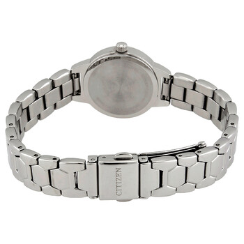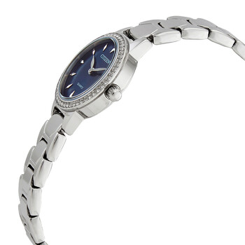 Stainless steel case with a stainless steel bracelet. Fixed stainless steel bezel set with crystals. Blue dial with silver-tone hands and index hour markers. Dial Type: Analog. Citizen Caliber 9627 quartz movement. Scratch resistant mineral crystal. Pull / push crown. Solid case back. Round case shape. Case size: 24 mm. Case thickness: 6.5 mm. Band width: 12 mm. Fold over clasp with a push button release. Water resistant at 50 meters / 165 feet. Functions: hour, minute. Dress watch style. Citizen Quartz Crystal Blue Dial Ladies Watch EZ7010-56L.