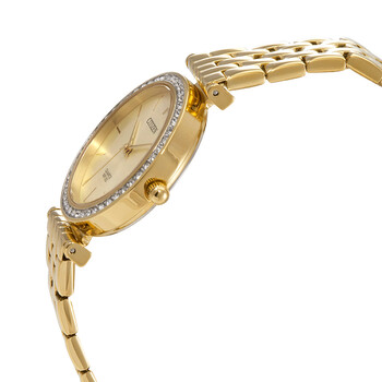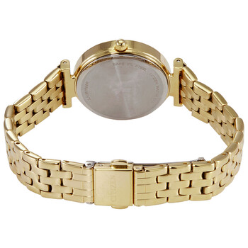 Gold-tone stainless steel case and bracelet. Fixed gold-tone bezel set with Swarovski crystals. Gold dial with gold-tone hands and index hour markers. Dial Type: Analog. Citizen caliber 9633 quartz movement. Scratch resistant mineral crystal. Pull / push crown. Solid case back. Round case shape. Case size: 30 mm. Case thickness: 6 mm. Band width: 14 mm. Fold over clasp with a push button release. Water resistant at 50 meters / 165 feet. Functions: hour, minute, second. Dress watch style. Watch label: Japan Movt. Citizen Quartz Crystal Gold Dial Gold-tone Ladies Watch ER0212-50P.