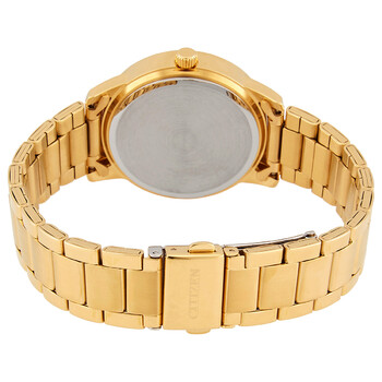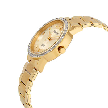 Gold-tone stainless steel case and bracelet. Fixed gold-tone bezel set with Swarovski crystals. Gold dial with gold-tone hands and dot hour markers. Arabic numerals marker appears at the 3, 6, 9 and 12 o'clock positions. Minute markers around the outer rim. Dial Type: Analog. Citizen caliber 1036 quartz movement. Scratch resistant mineral crystal. Pull / push crown. Solid case back. Round case shape. Case size: 35 mm. Case thickness: 9mm. Band width: 19 mm. Deployment clasp with a push button release. Water resistant at 50 meters / 165 feet. Functions: hour, minute, second. Dress watch style. Watch label: Japan Movt. Citizen Quartz Crystal Gold Dial Ladies Watch EL3092-86P.