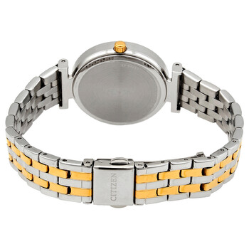 Stainless steel case with a two-tone (silver-tone and gold-tone) stainless steel bracelet. Fixed stainless steel bezel set with crystals. Mother of pearl dial with silver-tone hands and dot hour markers. Dial Type: Analog. Luminescent hands. Quartz movement. Scratch resistant mineral crystal. Pull / push crown. Solid case back. Round case shape. Case size: 30 mm. Case thickness: 7 mm. Band width: 14 mm. Fold over clasp with a push button release. Water resistant at 50 meters / 165 feet. Functions: hour, minute, second. Dress watch style. Citizen Quartz Crystal Mother of Pearl Dial Ladies Watch ER0214-54D.
