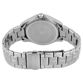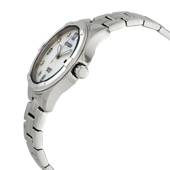 Stainless steel case with a stainless steel bracelet. Fixed stainless steel bezel. Mother of pearl dial with luminous silver-tone hands and crystal hour markers. Arabic numerals appear at the 3, 6, 9, and 12 o'clock positions. Dial Type: Analog. Luminescent hands. Date display at the 3 o'clock position. Citizen caliber G011 quartz movement. Scratch resistant mineral crystal. Pull / push crown. Solid case back. Round case shape. Case size: 32 mm. Case thickness: 7 mm. Deployment clasp. Water resistant at 50 meters / 165 feet. Functions: date, hour, minute, second. Casual watch style. Citizen Quartz Crystal Mother of Pearl Dial Ladies Watch EU6080-58D.