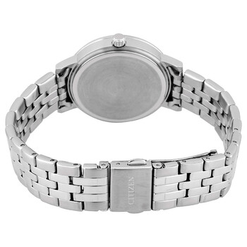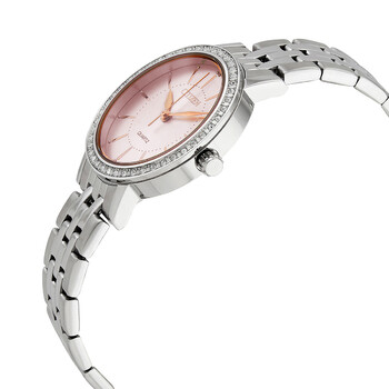 Stainless steel case with a stainless steel bracelet. Fixed stainless steel bezel set with crystals. Pink dial with pink hands and index hour markers. Minute markers around an inner ring. Dial Type: Analog. Citizen Caliber 1032 quartz movement. Scratch resistant mineral crystal. Pull / push crown. Solid case back. Round case shape. Case size: 31 mm. Case thickness: 8 mm. Band width: 14 mm. Fold over clasp with a safety release. Water resistant at 30 meters / 100 feet. Functions: hour, minute, second. Dress watch style. Citizen Quartz Crystal Pink Dial Ladies Watch EL3041-87X.