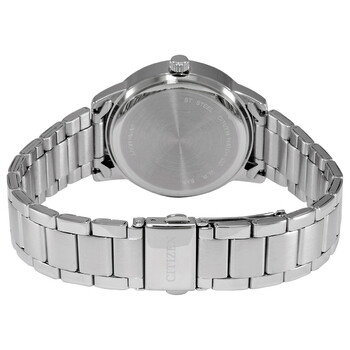 Stainless steel case with a stainless steel bracelet. Fixed stainless steel bezel set with crystals. Pink dial with silver-tone hands and crystal hour markers. Arabic numerals appear at the 3, 6, 9 and 12 o'clock positions. Minute markers around the outer rim. Dial Type: Analog. Quartz movement. Scratch resistant mineral crystal. Pull / push crown. Solid case back. Round case shape. Case size: 35 mm. Case thickness: 9 mm. Band width: 18 mm. Fold over clasp with a safety release. Water resistant at 50 meters / 165 feet. Functions: hour, minute, second. Dress watch style. Citizen Quartz Crystal Pink Dial Ladies Watch EL3090-81X.