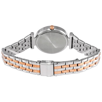 Stainless steel case with a two-tone (silver-tone and rose gold-tone) stainless steel bracelet. Fixed stainless steel bezel set with Swarovski crystals. Pink dial with luminous rose gold-tone hands and dot hour markers. Dial Type: Analog. Quartz movement. Scratch resistant mineral crystal. Pull / push crown. Solid case back. Round case shape. Case size: 30 mm. Case thickness: 7 mm. Band width: 14 mm. Fold over t with push button release clasp. Water resistant at 50 meters / 165 feet. Functions: hour, minute, second. Dress watch style. Citizen Quartz Crystal Pink Dial Ladies Watch ER0218-53X.