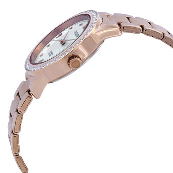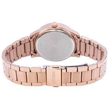 Rose gold-tone stainless steel case and bracelet. Fixed rose gold-tone bezel set with crystals. White dial with rose gold-tone hands and dot hour markers. Arabic numerals appear at the 3, 6, 9 and 12 o'clock positions. Minute markers around the outer rim. Dial Type: Analog. Quartz movement. Scratch resistant mineral crystal. Pull / push crown. Solid case back. Round case shape. Case size: 35 mm. Case thickness: 9 mm. Band width: 18 mm. Deployment clasp. Water resistant at 50 meters / 165 feet. Functions: hour, minute, second. Dress watch style. Watch label: Japan Movt. Citizen Quartz Crystal White Dial Ladies Watch EL3093-83A.