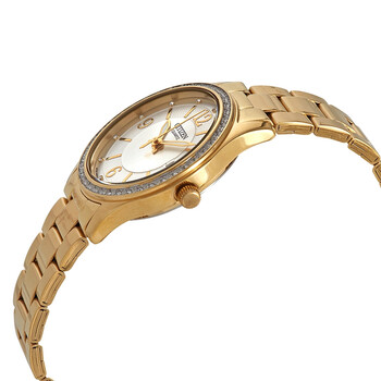 Gold-tone stainless steel case with a gold-tone stainless steel bracelet. Fixed gold-tone crystal set bezel. White dial with gold-tone hands and Arabic numeral and index and crystal hour markers. Dial Type: Analog. Luminescent hands. Date display at the 3 o'clock position. Quartz movement. Scratch resistant mineral crystal. Pull / push crown. Solid case back. Round case shape, case size: 34 mm, case thickness: 8 mm. Water resistant at 30 meters / 100 feet. Functions: date, hour, minute, second. Dress watch style. Watch label: Japan Movt. Citizen Quartz Crystal White Dial Ladies Watch EV0042-53A.