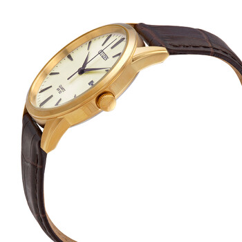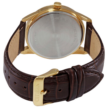 Gold-tone stainless steel case with a brown leather strap. Fixed gold-tone bezel. Gold dial with black hands and index hour markers. Minute markers around the outer rim. Dial Type: Analog. Date display at the 3 o'clock position. Citizen Caliber G111 quartz movement. Scratch resistant mineral crystal. Pull / push crown. Solid case back. Round case shape. Case size: 39 mm. Case thickness: 8 mm. Band width: 22 mm. Tang clasp. Water resistant at 50 meters / 165 feet. Functions: date, hour, minute, second. Casual watch style. Citizen Quartz Gold Dial Brown Leather Men's Watch BI5002-14A.