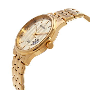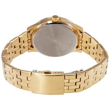 Gold-tone stainless steel case and bracelet. Fixed gold-tone bezel. Gold dial with luminous gold-tone hands and index hour markers. Arabic numeral minute markers (at 5 minute intervals). Minute markers around the outer rim. Dial Type: Analog. Luminescent hands and markers. Date display at the 4 o'clock position. Caliber 1112 quartz movement. Scratch resistant mineral crystal. Pull / push crown. Solid case back. Round case shape. Case size: 40 mm. Case thickness: 9 mm. Band width: 20 mm. Fold over clasp with a push button release. Water resistant at 50 meters / 165 feet. Functions: date, hour, minute, second. Dress watch style. Citizen Quartz Gold Dial Gold-tone Men's Watch BI1052-85P.
