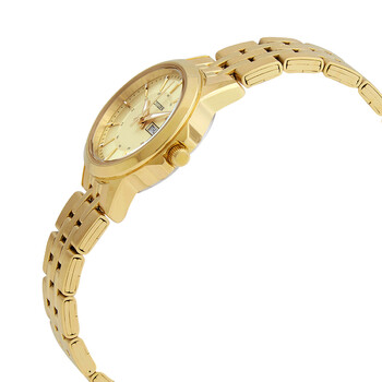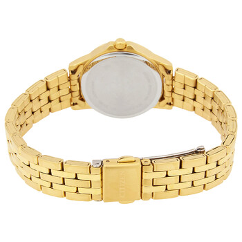Yellow gold-tone stainless steel case and bracelet. Fixed yellow gold-tone bezel. Gold-tone dial with yellow gold-tone hands and index hour markers. Arabic numeral minute markers (at 5 minute intervals). Minute markers around the outer rim. Dial Type: Analog. Luminescent hands and markers. Day & date display at the 3 o'clock position. Quartz movement. Scratch resistant mineral crystal. Pull / push crown. Solid case back. Round case shape. Case size: 28 mm. Case thickness: 8 mm. Band width: 14 mm. Fold over clasp with a push button release. Water resistant at 30 meters / 100 feet. Functions: date, day, hour, minute, second. Casual watch style. Citizen Quartz Gold Dial Yellow Gold-tone Ladies Watch EQ0603-59P.
