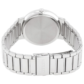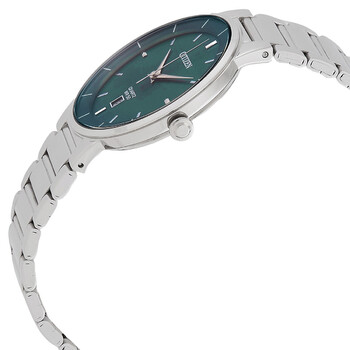 Silver-tone stainless steel case and bracelet. Fixed silver-tone stainless steel bezel. Green dial with silver-tone hands and index hour markers. Minute scale around the inner rim. Dial Type: Analog. Date display at the 6 o'clock position. Citizen Caliber G112-C0Z quartz movement. Scratch resistant mineral crystal. Solid case back. Round case shape, case size: 40 mm. Fold over clasp with a safety release. Water resistant at 50 meters / 165 feet. Functions: date, hour, minute, second. Sport watch style. Watch label: Japan Movt. Citizen Quartz Green Dial Men's Watch BI5120-51X.