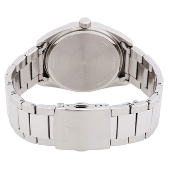 Silver-tone stainless steel case and bracelet. Fixed silver-tone stainless steel bezel. Green dial with luminous silver-tone hands and index hour markers. Minute markers around the outer rim. Dial Type: Analog. Luminescent hands. Date display at the 3 o'clock position. Citizen Caliber G112-C0A quartz movement. Scratch resistant sapphire crystal. Solid case back. Round case shape, case size: 41 mm. Fold over clasp with a safety release. Water resistant at 50 meters / 165 feet. Functions: date, hour, minute, second. Casual watch style. Watch label: Japan Movt. Citizen Quartz Green Dial Watch BI5110-54X.