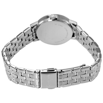 Stainless steel case with a stainless steel bracelet. Fixed stainless steel bezel. Grey dial with silver-tone hands and index hour markers. Dial Type: Analog. Date display at the 3 o'clock position. Citizen caliber G011 quartz movement. Scratch resistant mineral crystal. Pull / push crown. Solid case back. Round case shape. Case size: 28 mm. Case thickness: 6.5 mm. Band width: 14 mm. Deployment clasp with a push button release. Water resistant at 50 meters / 165 feet. Functions: date, hour, minute, second. Casual watch style. Citizen Quartz Grey Dial Stainless Steel Ladies Watch EU6090-54H.