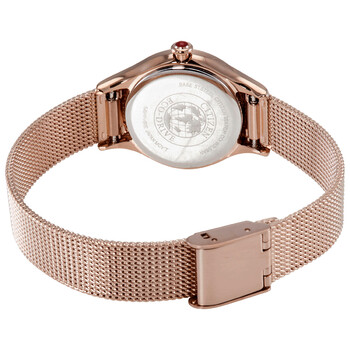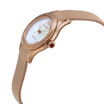 Rose gold-tone stainless steel case with a rose gold-tone stainless steel mesh bracelet. Fixed rose gold-tone bezel. Mother of pearl dial with rose gold-tone hands. Roman numeral appears at the 12 o' clock position. Dial Type: Analog. Calibre E031 eco-drive movement. Scratch resistant sapphire crystal. Pull / push crown. Solid case back. Round case shape. Case size: 26.5 mm. Fold over slip through clasp. Water resistant at 50 meters / 165 feet. Functions: hour, minute, second. Dress watch style. Watch label: Japan Movt. Citizen Quartz Mother of Pearl Dial Ladies Watch EM0783-85D.