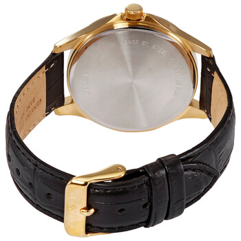 Gold-tone stainless steel case with a black leather strap. Fixed gold-tone bezel. Silver dial with luminous gold-tone hands and alternating Arabic numeral and index hour markers. Minute markers around the outer rim. Dial Type: Analog. Luminescent hands and markers. Day of the week and date display at the 3 o'clock position. Citizen caliber 1502 quartz movement. Scratch resistant mineral crystal. Pull / push crown. Solid case back. Round case shape. Case size: 41 mm. Case thickness: 8.8 mm. Band width: 20 mm. Tang clasp. Water resistant at 50 meters / 165 feet. Functions: date, day, hour, minute, second. Casual watch style. Watch label: Japan Movt. Citizen Quartz Silver Dial Black Leather Men's Watch BF2003-25A.