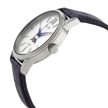 Stainless steel case with a blue leather strap. Fixed stainless steel bezel. Silver dial with blue hands and index hour markers. A Roman numeral appears at the 12 o'clock position. Minute markers around the outer rim. Dial Type: Analog. Moonphase display. Citizen caliber 6324 quartz movement. Scratch resistant mineral crystal. Pull / push crown. Solid case back. Round case shape. Case size: 42 mm. Case thickness: 10 mm. Band width: 20 mm. Tang clasp. Water resistant at 50 meters / 165 feet. Functions: hour, minute, second,moonphase. Casual watch style. Citizen Quartz Silver Dial Blue Leather Men's Watch AK5000-03A.