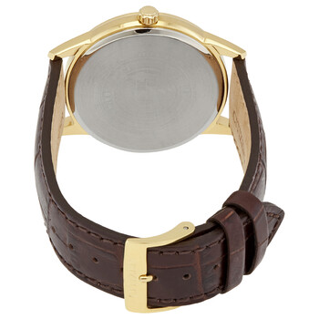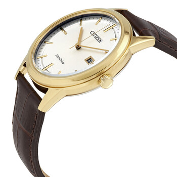 Gold-tone stainless steel case with a brown leather strap. Fixed gold-tone bezel. Silver dial with gold-tone hands and index hour markers. Minute markers around the outer rim. Dial Type: Analog. Date display at the 4 o'clock position. Citizen caliber Eco-Drive J810 quartz movement. Scratch resistant mineral crystal. Pull / push crown. Solid case back. Round case shape. Case size: 40 mm. Case thickness: 9 mm. Band width: 20 mm. Tang clasp. Water resistant at 30 meters / 100 feet. Functions: date, hour, minute, second, solar-powered. Casual watch style. Watch label: Japan Movt. Citizen Quartz Silver Dial Brown Leather Men's Watch AW1233-01A.
