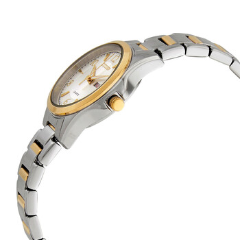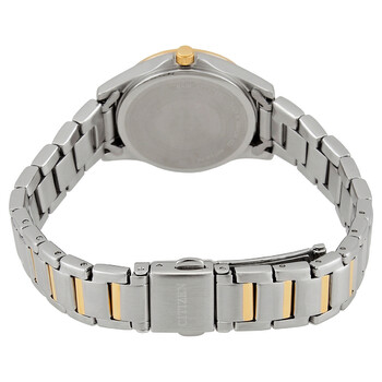 Stainless steel case with a two-tone (silver-tone and gold-tone) stainless steel bracelet. Fixed gold-tone bezel. Silver dial with luminous gold-tone hands and alternating Arabic numeral and index hour markers. Minute markers around the outer rim. Dial Type: Analog. Luminescent hands. Day of the week and date display at the 3 o'clock position. Citizen caliber 1002 quartz movement. Scratch resistant mineral crystal. Pull / push crown. Solid case back. Round case shape. Case size: 27.5 mm. Case thickness: 7.7 mm. Band width: 14 mm. Deployment clasp. Water resistant at 50 meters / 165 feet. Functions: date, day, hour, minute, second. Casual watch style. Citizen Quartz Silver Dial Ladies Watch EQ0595-55A.