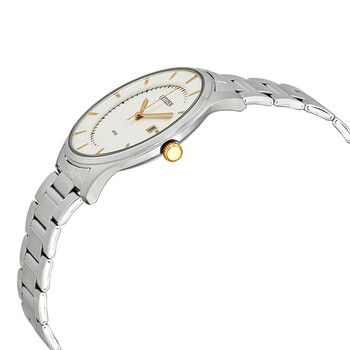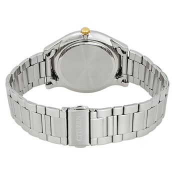 Stainless steel case with a stainless steel bracelet. Fixed stainless steel bezel. Silver dial with brown hands and index hour markers. Minute markers around an inner ring. Dial Type: Analog. Date display at the 3 o'clock position. Citizen Caliber 0410 quartz movement. Scratch resistant mineral crystal. Pull / push crown. Solid case back. Round case shape, case size: 39 mm, case thickness: 7 mm. Fold over clasp. Water resistant at 50 meters / 165 feet. Functions: date, hour, minute, second. Casual watch style. Watch label: Japan Movt. Citizen Quartz Silver Dial Men's Watch BD0041-54B.