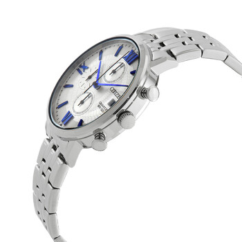 Stainless steel case with a stainless steel bracelet. Fixed stainless steel bezel. Silver dial with blue hands and index hour markers. Roman numerals appear atthe 3, 6, 9 and 12 o'clock positions. Minute markers around the outer rim. Dial Type: Analog. Date display at the 3 o'clock position. Chronograph - three sub-dials displaying: 60 second, 60 minute and 12 hour. Citizen caliber 0510 quartz movement. Scratch resistant mineral crystal. Solid case back. Round case shape. Case size: 41 mm. Case thickness: 11.2 mm. Band width: 20 mm. Deployment clasp. Water resistant at 50 meters / 165 feet. Functions: date, hour, minute, second. Casual watch style. Citizen Quartz Silver Dial Stainless Steel Men's Watch AN3610-71A.